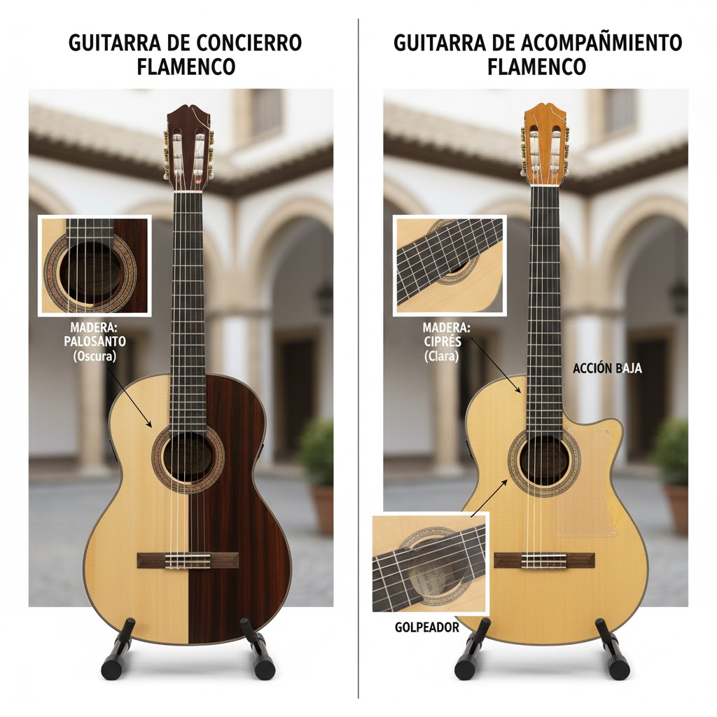 El sonido de una guitarra de concierto y de acompañamiento refleja la intención artística de quien la toca. La de concierto tiene una voz más abierta y profunda; está pensada para emocionar al público con un solo. La de acompañamiento, en cambio, mantiene el alma del flamenco más puro: suena más cruda, más rítmica y directa.